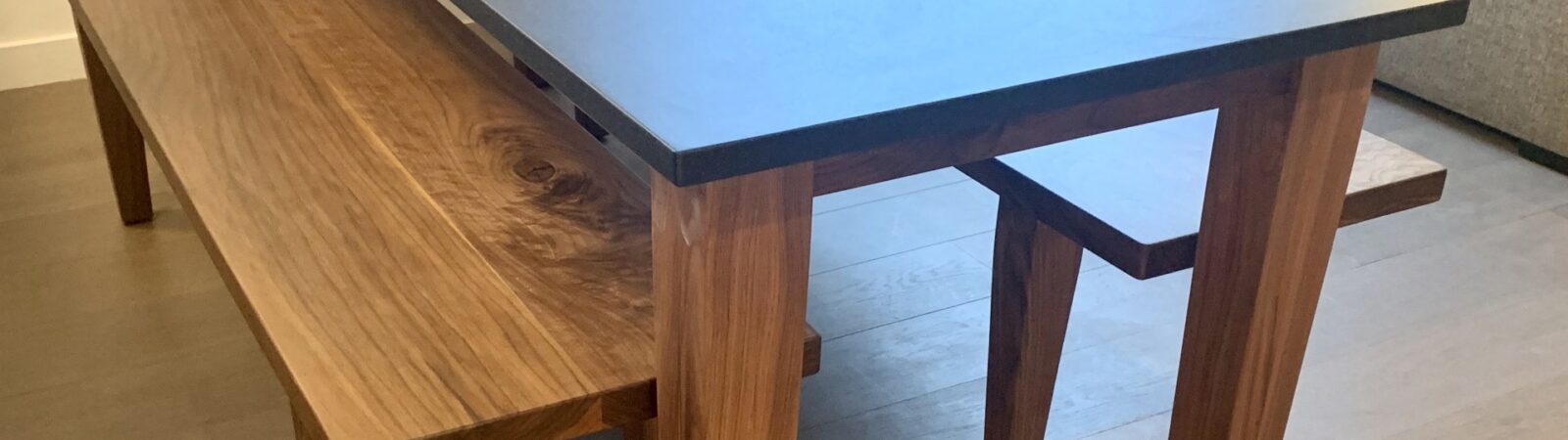 Custom Black Walnut table base with benches and Churchill Soapstone table top